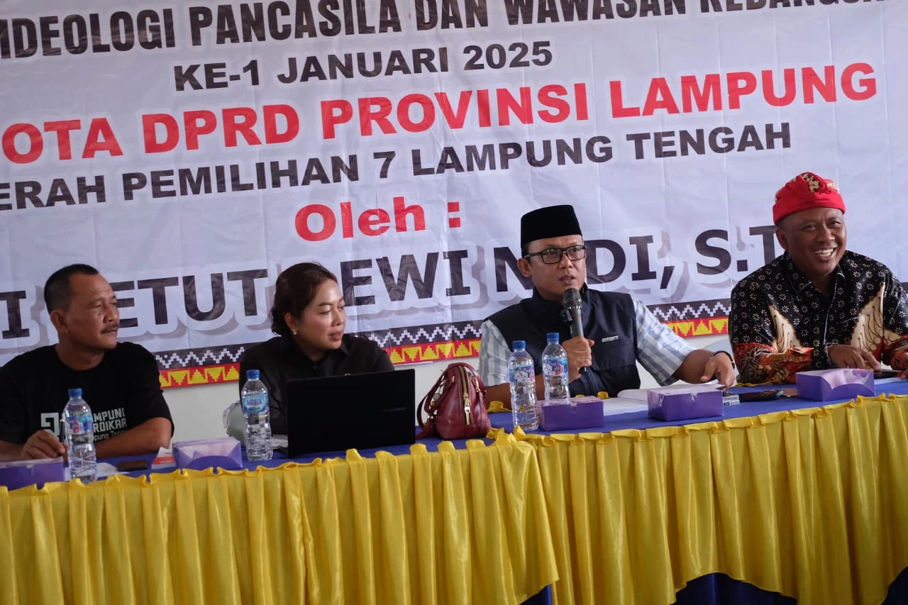 Bandar lampung-Anggota DPRD Provinsi Lampung Dapil Lampung Tengah, Ni Ketut Dewi Nadi, menggelar kegiatan Sosialisasi Pembinaan Ideologi Pancasila dan Wawasan Kebangsaan di Balai Kampung Swastika Buana (SB 13), Kecamatan Seputih Banyak, Lampung Tengah, pada Minggu (19/1).