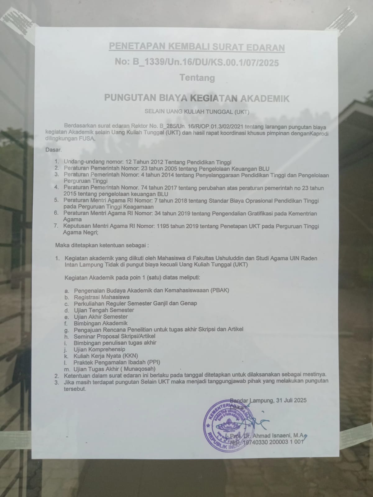 Bandar Lampung (Kaganga.id)Pasca viral pemberitaan dugaan Pungutan Liar (Pungli) di Fakultas Ushuluddin Universitas Islam Negeri (UIN) Raden Intan Lampung (RIL), Kini Pihak Fakultas menerbitkan edaran melarang adanya pungutan biaya kegiatan akademik.
