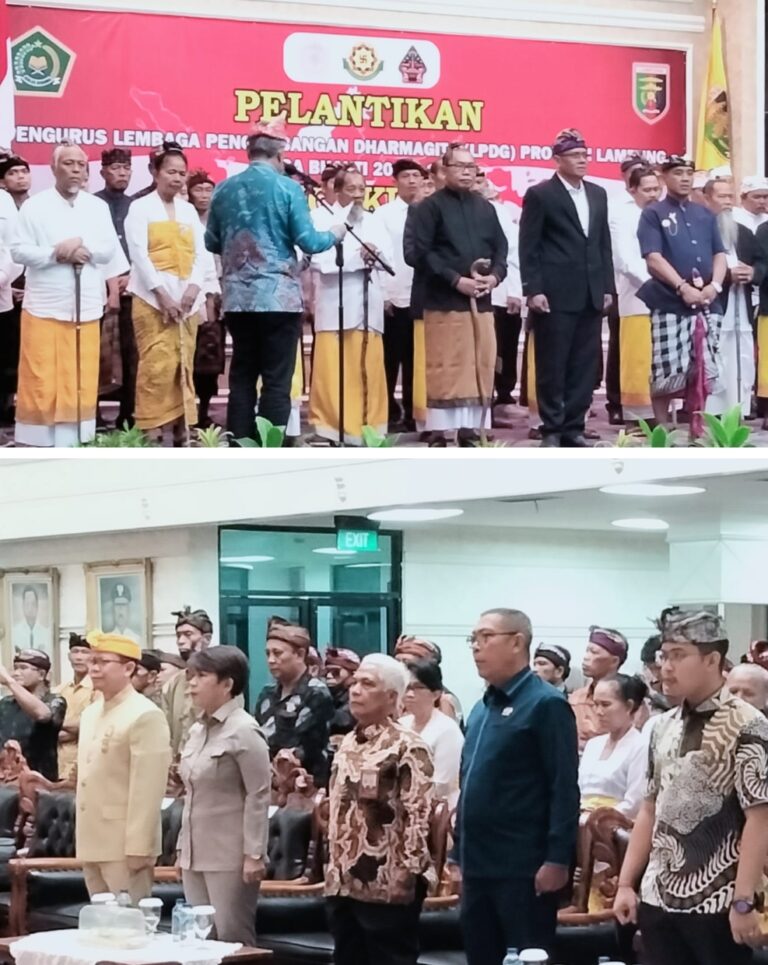 Bandar Lampung(kaganga.id)— Lembaga Pengembangan Dharma Gita (LPDG) Provinsi Lampung resmi dilantik, bersamaan dengan Pengukuhan Pengurus Sabha Kertha, dan Majelis Adat Perkraman Provinsi Lampung Masa Bhakti 2025-2030. Di Balai Keratun Lingkungan Pemerintah setempat. Kamis (14/08/2025). Hadir dalam pelantikan, Anggota Komisi II DPRD Provinsi Lampung, I Made Suarjaya, Anggota Komisi V DPRD Provinsi Lampung, Budhi Condrowati, dan Ketut Rameo.