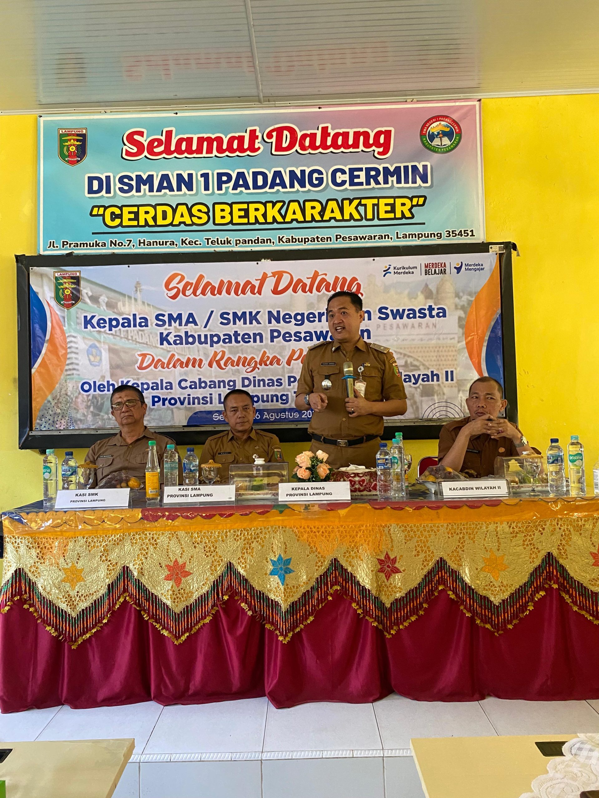 Pesawaran(kaganga.id)-Kepala Dinas Pendidikan dan Kebudayaan Provinsi Lampung, Thomas Amirico, S.STP., S.H., melaksanakan kegiatan pembinaan bagi seluruh kepala sekolah jenjang SMA/SMK Negeri dan Swasta se-Kabupaten Pesawaran. Kegiatan berlangsung di SMAN 1 Padang Cermin, Kabupaten Pesawaran, pada Selasa, 26 Agustus 2025.