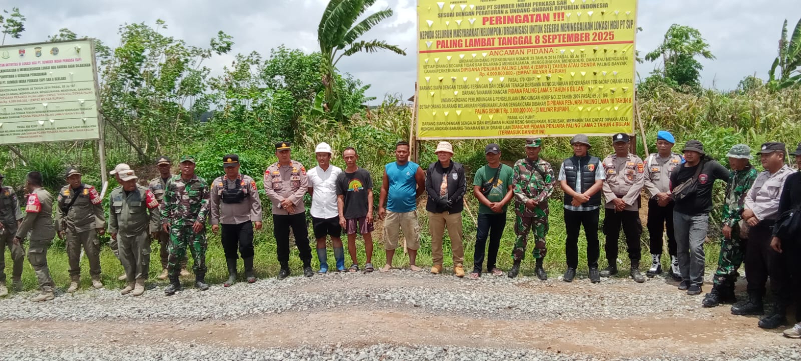 Spanduk tersebut memuat ancaman pidana dan batas waktu pengosongan hingga 8 September 2025, memicu kekhawatiran akan terjadinya konflik agraria besar-besaran.