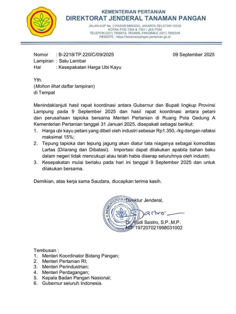 Keputusan ini merupakan tindak lanjut dari dua forum penting, rapat koordinasi antara gubernur dan bupati se-Provinsi Lampung pada 9 September 2025, serta rapat antara petani dan pengusaha tapioka bersama Menteri Pertanian pada 31 Januari 2025.