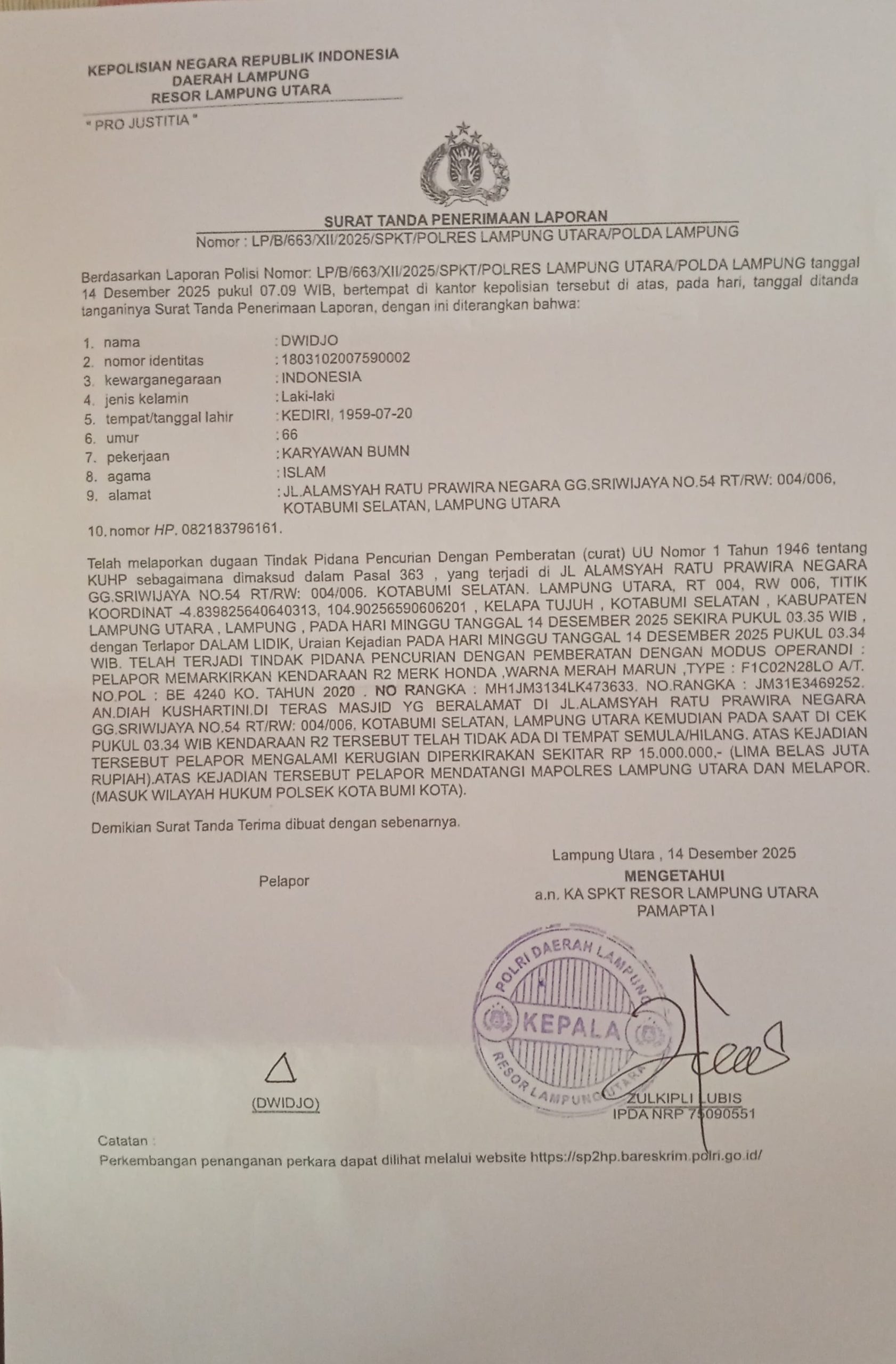Korban diketahui bernama Dwidjo, warga Jalan Alamsyah Ratu Perwira Negara, Gang Sriwijaya Nomor 54, RT 004 RW 006. Ia kehilangan sepeda motor Honda Scoopy berwarna merah marun dengan nomor polisi BE 4240 KO.