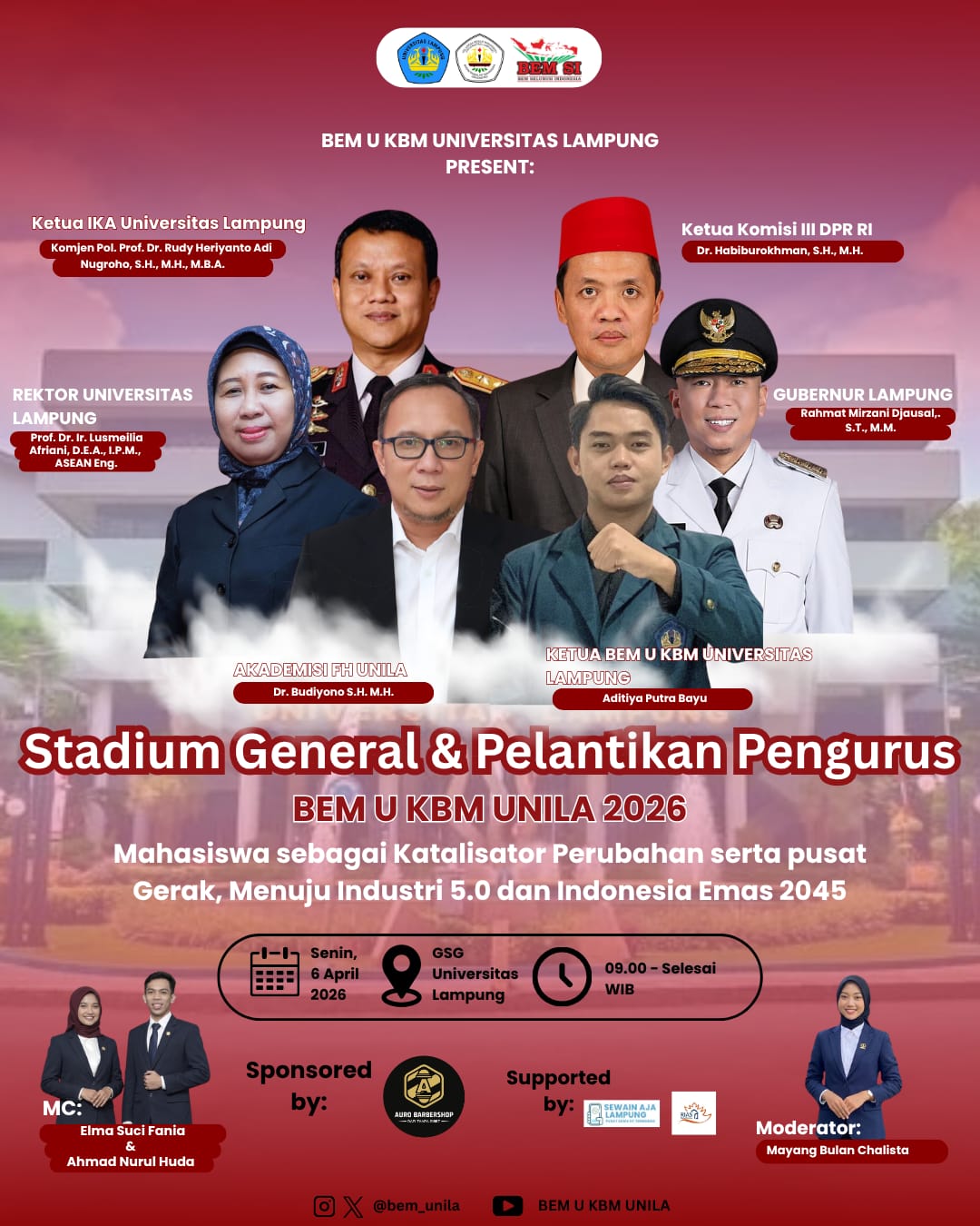 Budiyono mengingatkan, kepada pengurus BEM Universitas Lampung 2026, bahwa pelantikan bukan sekadar seremonial, melainkan awal dari amanah besar.