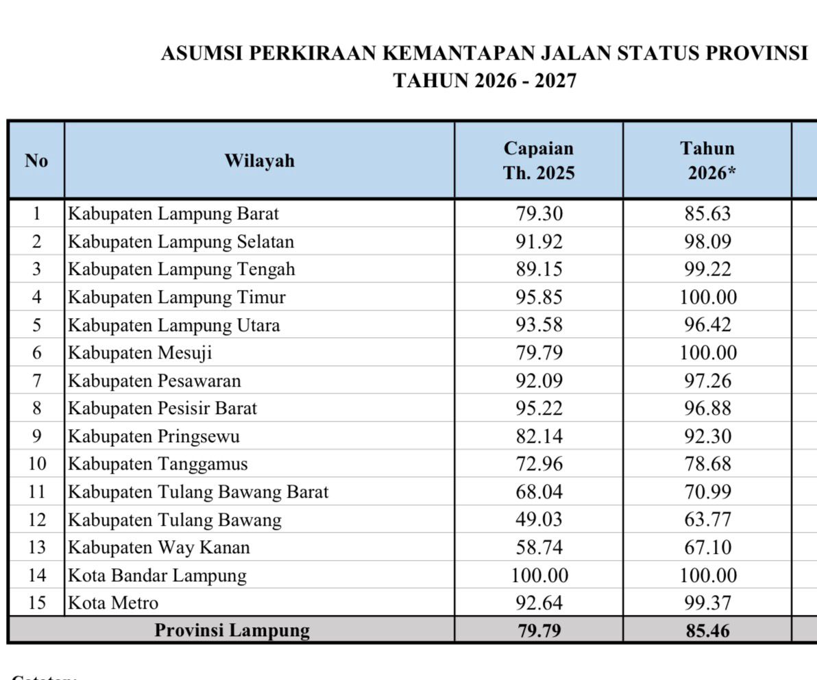 Kaganga.id — Pemerintah Provinsi Lampung mempercepat pembangunan infrastruktur dengan fokus utama pada jalan berstatus provinsi yang tersebar di wilayah kabupaten. Data terbaru tahun 2026 menunjukkan bahwa peningkatan kemantapan jalan tidak hanya terjadi di perkotaan, tetapi justru didorong oleh panjang dan dominasi ruas jalan provinsi yang berada di kabupaten.